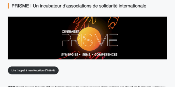 L’incubateur PRISME, porté par Centraider en Centre-Val de Loire, accompagne sur 9 mois les associations engagées en coopération internationale. À travers des rencontres individuelles et collectives avec des experts, il renforce la gouvernance associative, la méthodologie de projet et la pérennité des actions. Ouvert aux structures de plus de deux ans, ayant déjà mené un projet de solidarité internationale, PRISME soutient la consolidation et le développement de nouvelles initiatives à l’international.