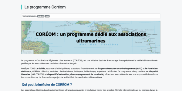 Karib Horizon, partenaire du programme CORÉOM, propose ateliers thématiques (ECSI, ODD, culture et développement), outils pratiques et montée en compétences en gestion de projet et financements régionaux/internationaux. L’accompagnement collectif et individuel couvre dépôt, suivi des lauréats Unite Caribbean et animation territoriale. Réunions et rencontres informent les associations de Guadeloupe, Guyane, Martinique, Mayotte et La Réunion, pour renforcer capacités et financer projets de coopération internationale avec La Guilde, l’AFD et la Fondation de France.