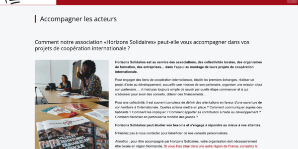 Horizons Solidaires accompagne associations, collectivités, organismes de formation et entreprises normandes dans leurs projets de coopération internationale. Appui-conseil individualisé, ateliers collectifs et formations permettent de structurer les initiatives, trouver des financements et mobiliser des partenaires. Fort d’un réseau local, régional et national, l’accompagnement couvre toutes les étapes : définition des besoins, montage de projets, partenariats, communication et mobilisation citoyenne, avec un soutien particulier à l’engagement des jeunes.