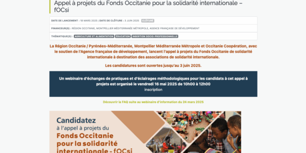 Le Fonds Occitanie pour la solidarité internationale (fOCsi) soutient les associations d’Occitanie menant des projets dans un pays éligible à l’aide publique au développement. Cofinancé par la Région Occitanie, Montpellier Méditerranée Métropole et l’AFD, il cible l’agriculture et la sécurité alimentaire, l’éducation et l’insertion socio-professionnelle. Les projets, réalisés avec un partenaire local, doivent durer 12 à 30 mois et inclure des actions de sensibilisation aux ODD en Occitanie.