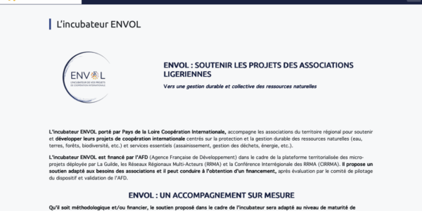 L’incubateur ENVOL, porté par Pays de la Loire Coopération Internationale et financé par l’AFD, accompagne les associations ligériennes dans leurs projets de coopération internationale liés à la gestion durable des ressources naturelles et aux services essentiels. Adapté au niveau de maturité des projets, il propose un soutien méthodologique et/ou financier sur mesure. ENVOL vise à renforcer l’impact des micro-projets, favoriser les synergies territoriales et contribuer à plusieurs ODD (6, 7, 12, 13, 14).