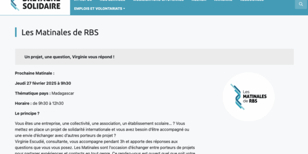 Les Matinales de RBS offrent un temps d’échange et d’accompagnement de 3h pour entreprises, collectivités, associations ou établissements scolaires impliqués dans un projet de solidarité internationale. Animées par la consultante Virginie Escudié, ces rencontres limitées à cinq participants favorisent le partage d’expériences, de conseils et de contacts. Un rendez-vous convivial pour poser ses questions, renforcer ses projets et créer des synergies entre porteurs d’initiatives.