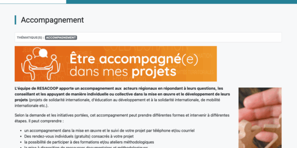 RESACOOP accompagne gratuitement les acteurs d’Auvergne-Rhône-Alpes dans leurs projets de solidarité internationale, ECSI ou mobilité. L’appui inclut conseils personnalisés, rendez-vous individuels, formations, ateliers, ressources méthodologiques, mise en réseau, rencontres thématiques et missions d’expertise (Explor). L’accompagnement intervient à toutes les étapes, du montage au suivi, avec orientation vers partenaires locaux ou thématiques, pour renforcer et développer les initiatives régionales de coopération internationale.