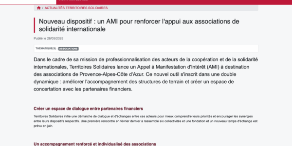 Territoires Solidaires lance un Appel à Manifestation d’Intérêt pour les associations de Provence-Alpes-Côte d’Azur engagées en solidarité internationale. L’objectif : offrir un accompagnement personnalisé et renforcer le dialogue avec les partenaires financiers. Ce dispositif aide à identifier les financements adaptés, améliorer la stratégie de recherche de fonds et favoriser les synergies régionales. Un premier contact via un formulaire simple amorce un parcours vers des projets de qualité.