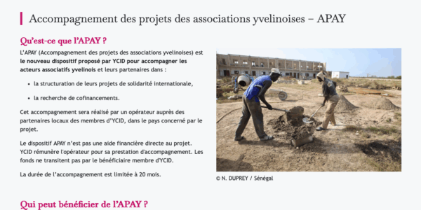 YCID lance l’APAY, un dispositif d’accompagnement destiné aux associations yvelinoises membres pour structurer leurs projets de solidarité internationale et rechercher des cofinancements. Réalisé par un opérateur auprès des partenaires locaux, l’appui dure jusqu’à 20 mois et ne constitue pas une aide financière directe. Éligible pour des projets dans les pays listés par YCID, l’APAY cible la lutte contre la pauvreté en lien avec les Objectifs de développement durable.