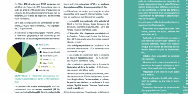 BFC International propose un accompagnement personnalisé aux porteurs de projets de solidarité internationale : conseils en ingénierie, recherche de financements, aspects juridiques, préparation de missions, accueil de partenaires et stratégie internationale. L’appui se fait en rendez-vous ou à distance, avec ressources et suivi dans la durée. L’équipe favorise synergies et mise en réseau, notamment lors des pics de demandes liés aux dépôts de subventions et retours de missions.